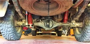 We considered two options: a double 2″ shock absorber or a single 2.5″ shock absorber. In the end we opted for a PROFENDER DAKAR EXTREMEof 2.5″. Installation was much simpler and, unlike the rear axle, the mounts were not subjected to such high loads. The spring was calculated to help us avoid compression damping and the dampers were set up with fairly high working pressures to control bounce.
